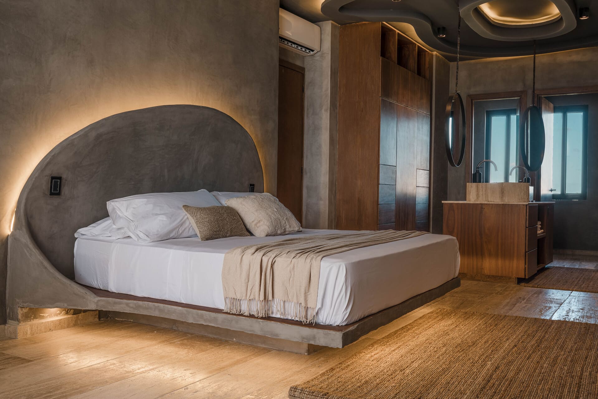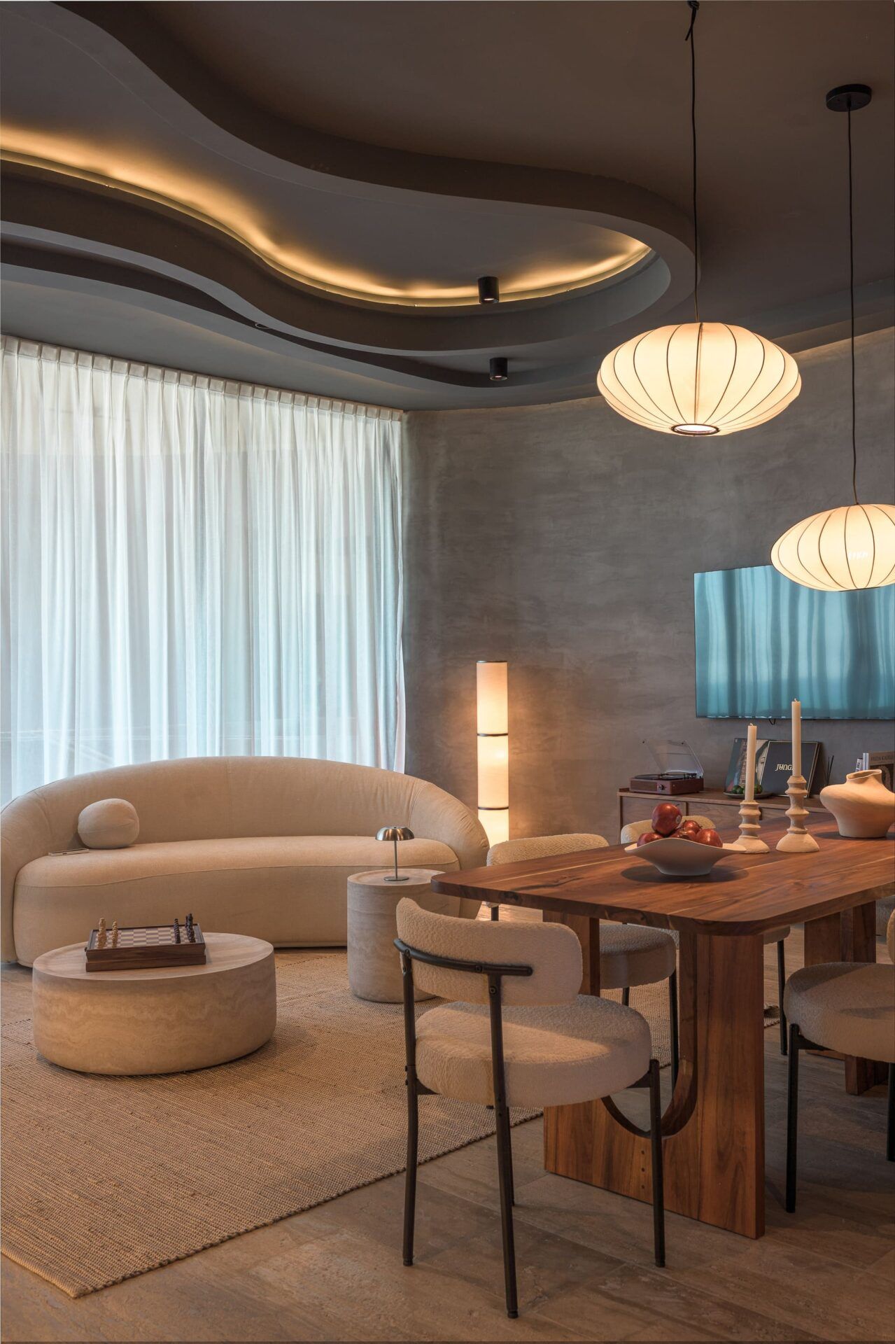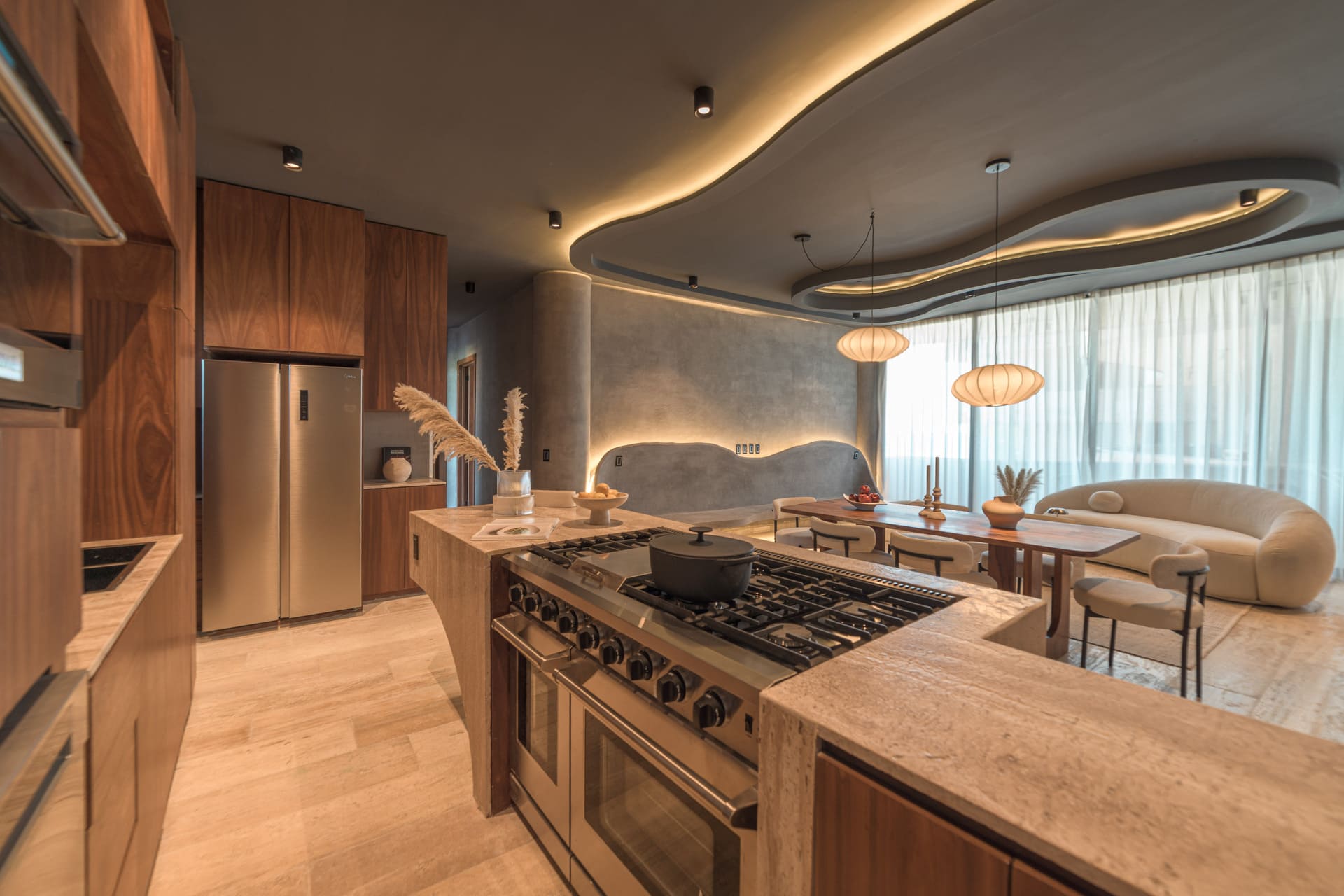 Con una superficie total de 208 m², este departamento ofrece tres amplias habitaciones y tres baños y medio, con un diseño interior que fluye de manera natural entre los espacios. Los acabados de lujo y las formas curvas evocan la tranquilidad del entorno tropical, mientras las vistas panorámicas al mar llenan cada rincón de luz y serenidad.
