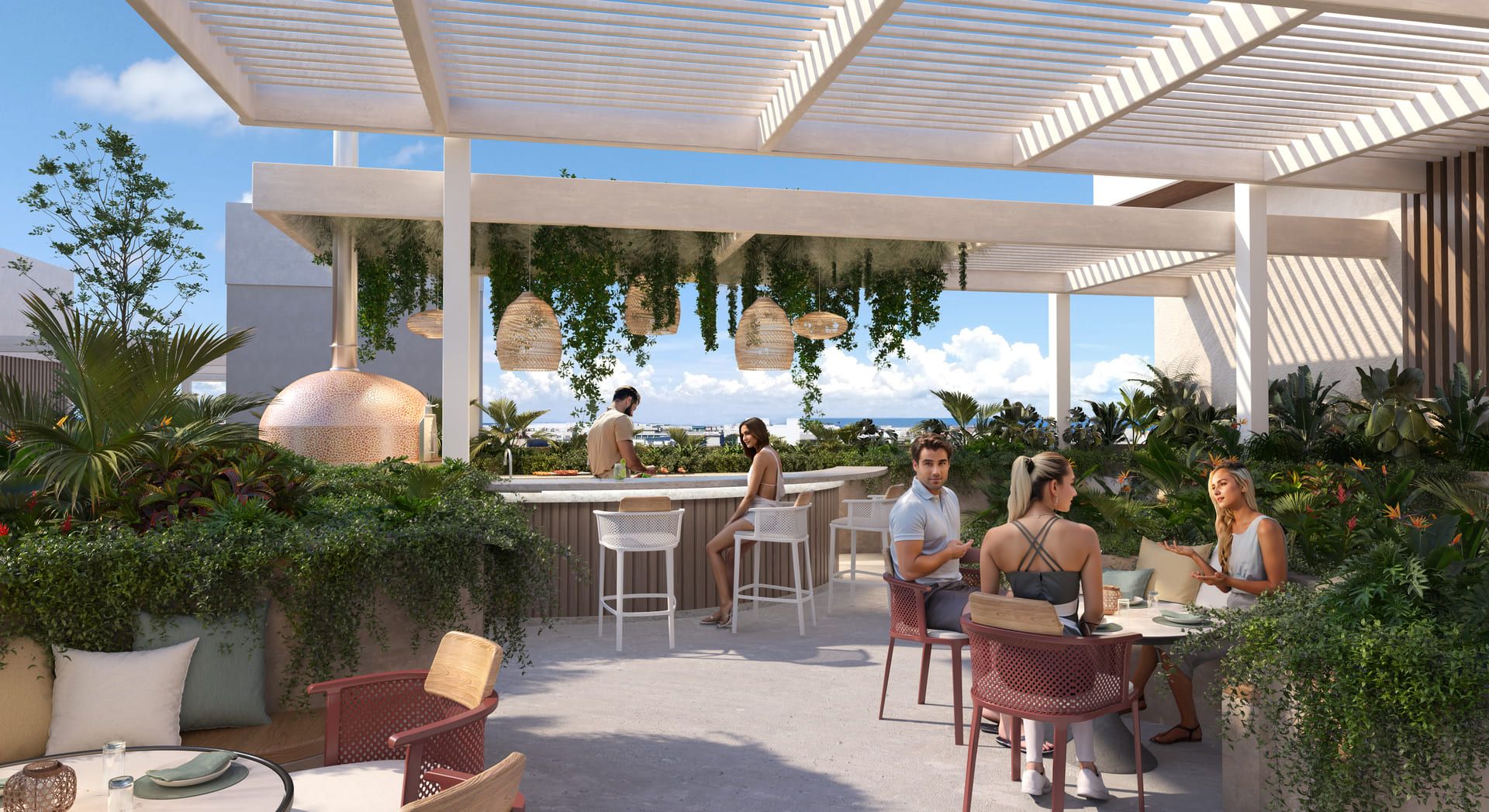 Los departamentos destacan por su arquitectura de líneas limpias y proporciones equilibradas. Además, los interiores se conectan de manera natural con el exterior. Los techos altos, las distribuciones inteligentes y los ventanales de piso a techo permiten que la luz natural inunde cada ambiente. Como resultado, los espacios se sienten amplios y luminosos. Los acabados de alta calidad, incluyendo suelos de mármol y carpintería en maderas nobles, aportan una estética atemporal y elegante. Por su parte, las cocinas, concebidas como el corazón del hogar, integran tecnología moderna y superficies de piedra natural. Así, logran un equilibrio perfecto entre diseño y funcionalidad. Cada unidad está completamente amueblada, lista para ofrecer comodidad inmediata sin comprometer estilo ni elegancia.
